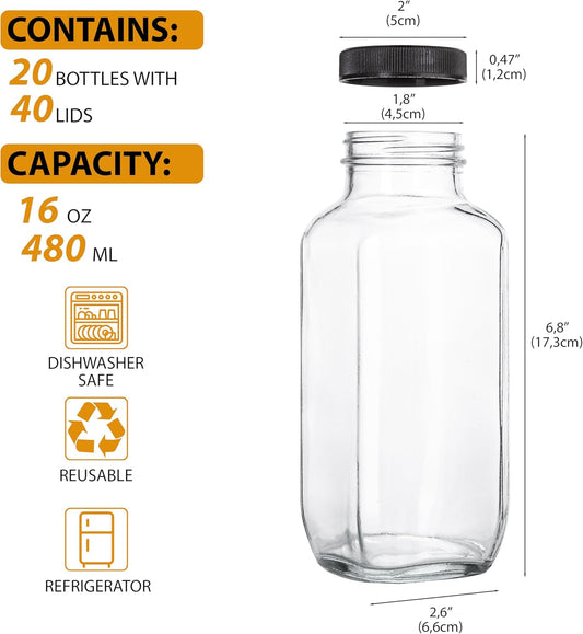 Juice Bottles with Lids, 16 Oz - Set of 20 - Clear Glass Jars with Caps - Reusable Empty Drink Containers for Juicing, Smoothies, Water, Milk, Kombucha Storage, Wellness Shots and More (20)