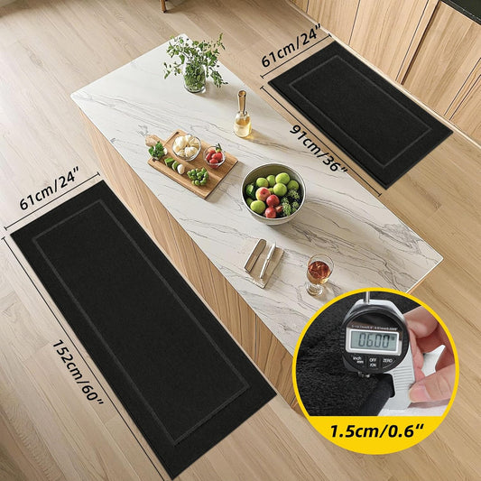 JSEI Kitchen Rugs, Non-Slip Kitchen Mats for Floor, Soft Washable Absorbent Kitchen Mats 2 Pieces, Kitchen Carpet Runner with TPR Backing, Polyester, 24”x36”+24”x60”, Black