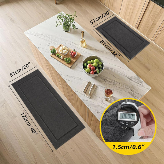 JSEI Non-Slip Kitchen Mats, Self Adhesive No Sliding Kitchen Rugs Set of 2, Washable Absorbent Floor Mat for Kitchen, Bathroom, Laundry Room, Bedroom, 20”x32”+20”x48”, Dark Grey, Rectangular Pattern