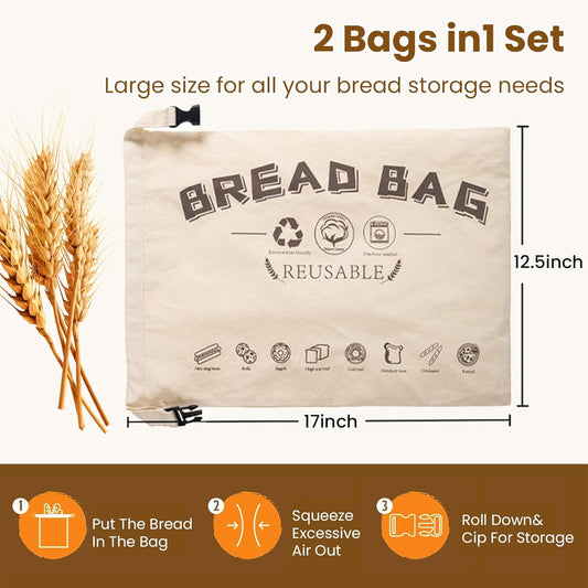 2-Pack Bread Bags, Reusable Bread Bags for Homemade Bread, Buckle Closure,Fresh Keeping Extra Large Bags, Food Bag (Beige)