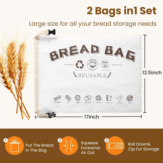 2-Pack Bread Bags, Reusable Bread Bags for Homemade Bread, Buckle Closure,Fresh Keeping Extra Large Bags, Food Bag (Mix colour)