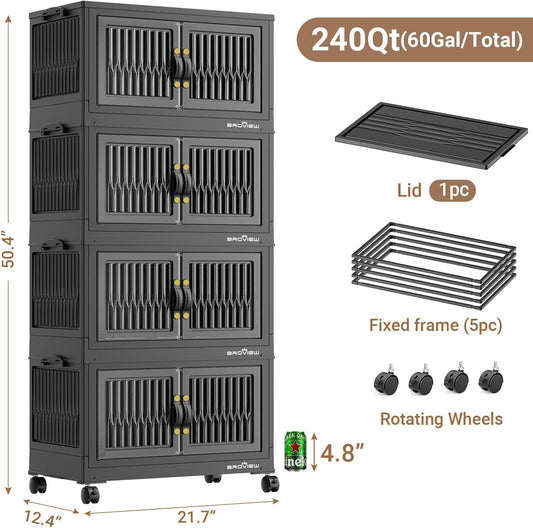 240Qt Stackable Storage Bins with Lid, Extra Large Closet Organizer Collapsible Drawer Boxes with Wheels, Folding Plastic Cabinet Containers for Home Kitchen Room Organization, 4Pack Black