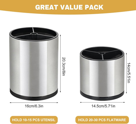 2Pack Kitchen Utensil Holder Set - 360° Rotating Stainless Steel Large Cooking Utensil Stand for Counter, 3 Compartment Flatware Caddy with Removable Base for Knife, Fork & Spoon Organizer - Sliver
