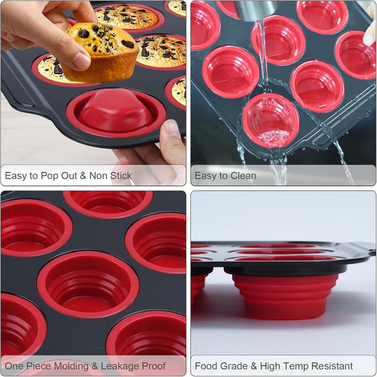 Silicone Muffin Pan, 12 Cups Cupcake Pans with Metal Frame Nonstick Muffin Tins Easy to Pop Out for Baking Cupcake Egg Bites BPA-free Cupcake Pan Mold (12 Cups-Red)