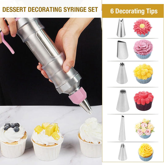 Dessert Decorating Syringe Set Frosting Piping Kit Stainless Steels Cake Decorating Tool 6 Russian Piping Icing Nozzles Cream Scraper Cupcake Frosting Filling Injector Cake Icing Tools