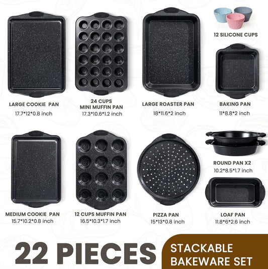 Kikcoin 22 PCS Nonstick Baking Pans Set, Stackable Bakeware Sets with Silicone Handles, 450°F Oven Safe Baking Sheet set, Easy Release Cookie Sheets for Baking, Black