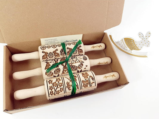 EASTER 3 Mini Embossed Rolling Pin Set. Wooden Laser Cut Embossing Rolling Pins for Embossed Cookies. Easter, Rabbit, Egg, Chicken, Spring, Flowers from Algis Crafts