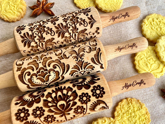 FLORAL 3 Small Textured Rolling Pin Set. Wooden laser engraved embossing dough roller for embossed cookies gift for Birthday, Easter by Algis Crafts