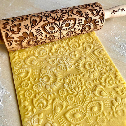 FOLKSY FLOWERS Embossing Rolling Pin. Laser Engraved Dough Roller with Folk Pattern for Embossed Cookies and Pottery by Algis Crafts