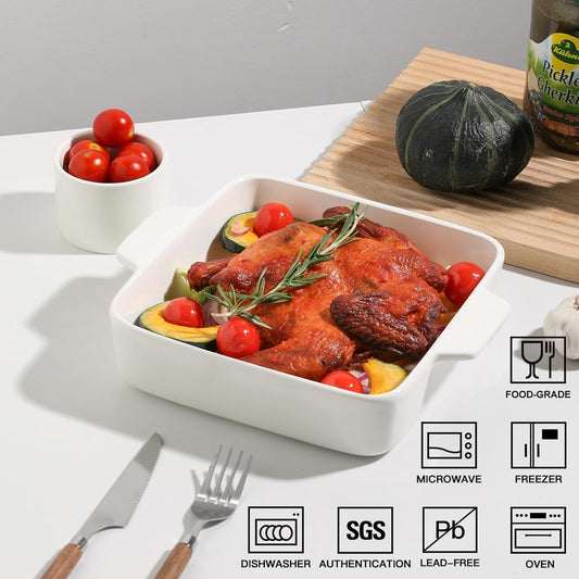 Sweejar Ceramic Baking Dish, 9 x 9 Cake Baking Pan for Brownie, Porcelain Square Bakeware with Double Handle for Casserole, Lasagna, Family Dinner (White)