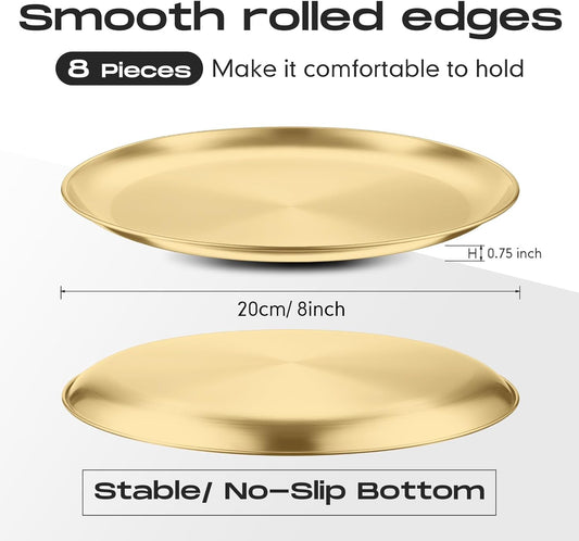 Thenshop 8 Pieces 8 Inch Pizza Pans Bulk Stainless Steel Sets Round Bakeware Pizza Trays for Oven Kitchen Baking Home Restaurant Safe Sturdy Reusable Easy Clean(Gold)