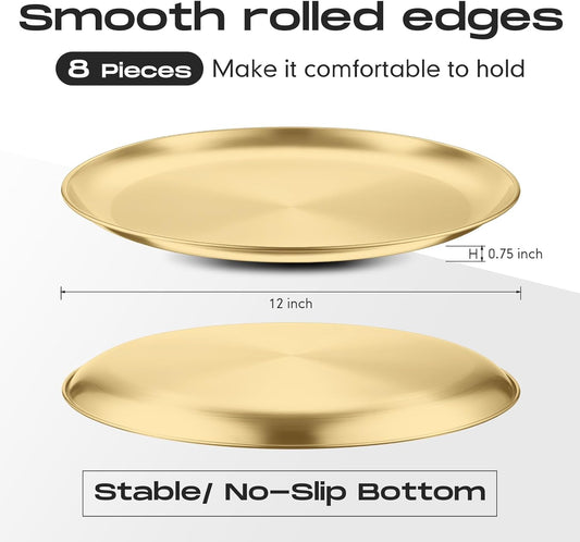 Thenshop 8 Pieces 12 Inch Pizza Pans Bulk Stainless Steel Sets Round Bakeware Pizza Trays for Oven Kitchen Baking Home Restaurant Safe Sturdy Reusable Easy Clean(Gold)