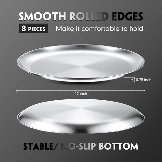 Thenshop 8 Pieces 12 Inch Pizza Pans Bulk Stainless Steel Sets Round Bakeware Pizza Trays for Oven Kitchen Baking Home Restaurant Picnics Holiday Activities Safe Sturdy Reusable Easy Clean(Silver)