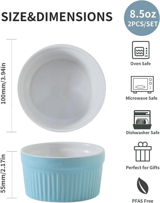 Hasense Ramekins Oven Safe, 8 oz Creme Brulee Ramekins Set of 2, Microwave & Dishwasher Safe Souffle Baking Cups for Pudding, Ice Cream, Custard, Dessert Bowls Porcelain, Sky Blue