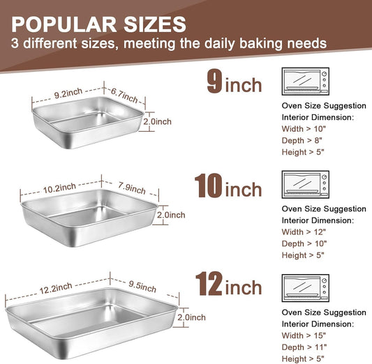 Baking Pans Set of 3, Commercial Grade Stainless Steel Cookie Pan for Baking, 12/10/9 Inch, Rectangle Bakeware Set for Cakes Breads Lasagna Casseroles, Rust & Warp Resistant & Nonstick, Heavy Duty