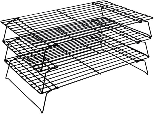 Restaurantware Met Lux 15.7 x 9.8 x 8.3 Inch Wire Baking Rack Set 1 Stackable Oven Wire Rack Set - 3-Tier Design Oven-Ready Up To 392F Black Iron Cooling Rack Set With Collapsible Feet