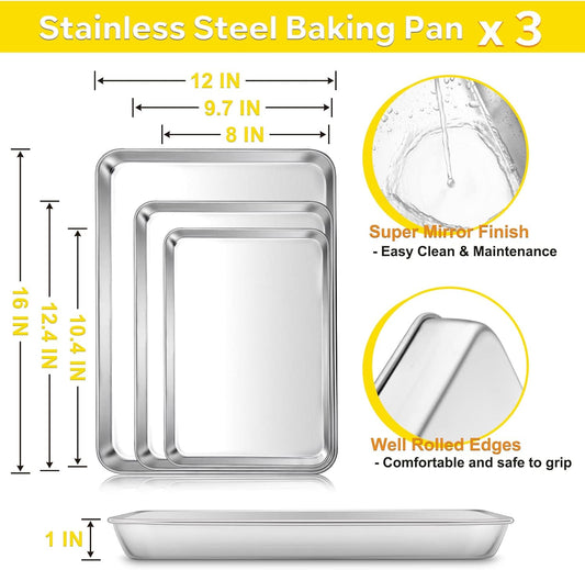 E-far Baking Cookie Sheet Pan Set of 3, 16/12.4/10.4 Inch, Stainless Steel Baking Pans Set for Oven, Rectangle Baking Tray for Cooking Roasting, Non Toxic & Easy Clean, Dishwasher Safe