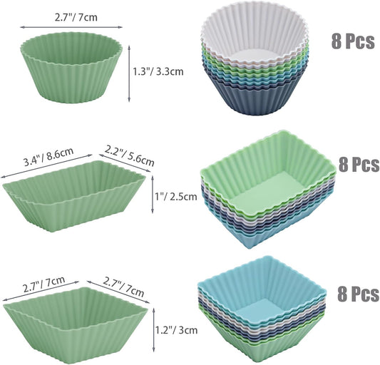 24-Pack Silicone Cupcake Liners, Reusable Muffin Cups – Round, Square & Rectangle Baking Cups, Non-Stick, Easy to Clean, Bento Box Accessories, Lunch Box Dividers for Kids
