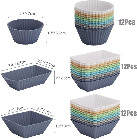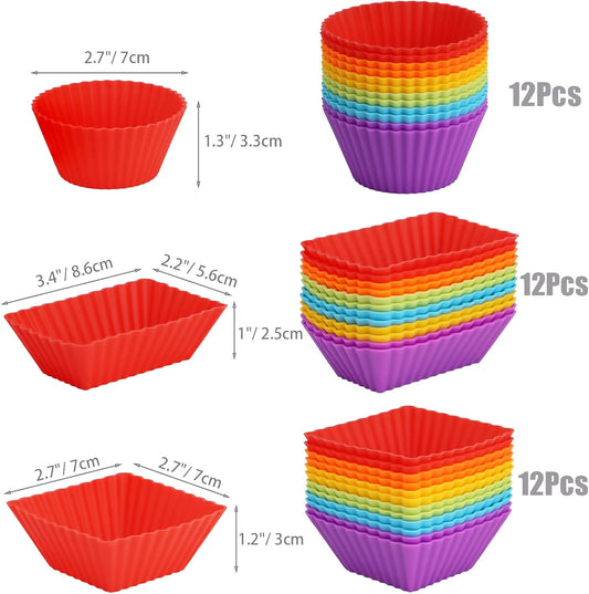 12-Pack Silicone Cupcake Liners, Reusable Muffin Cups – Round, Square & Rectangle Baking Cups, Non-Stick, Easy to Clean, Bento Box Accessories, Lunch Box Dividers for Kids