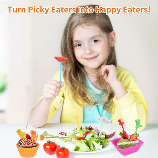 60PCS Silicone Lunch Box Dividers, Heavy-Duty Silicone Cupcake Liners for Muffin Cups, Reusable Kids' Lunch/Bento Box Accessories Set with Animal Forks, Food-Grade, BPA Free(20 Liners + 40 Picks)
