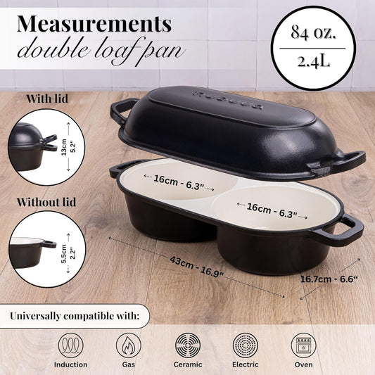 nuovva Dutch Oven for Sourdough Bread Baking – Enamelled Cast Iron Bread Loaf Pot – 500°F Oven Safe Non Stick Bread Pot – Double Round Loaf Space, 16.5cm Diameter, Black