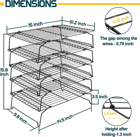 P&P CHEF Cooling Rack, 5-Tier Stainless Steel Stackable Baking Cooking Racks for Cooling Roasting Grilling, Collapsible & Heavy Duty, Oven Safe & Easy Clean, 15" x 10", Black