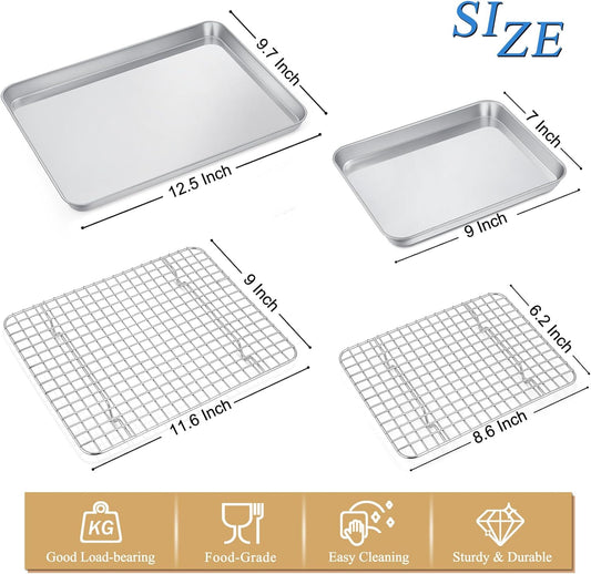 P&P CHEF 12.5 + 9 Inch Baking Sheet and Rack Set, Stainless Steel Cookie Sheets Oven Baking Pans Trays with Cooling Racks for Cooking & Roasting, Oven & Dishwasher Safe, (4Pcs)