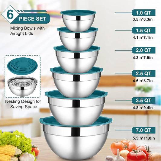 LIANYU Mixing Bowls with Visible Lid Sets of 6, Stainless Steel Metal Salad Nesting Bowls, Large & Small 7, 3.5, 2.5, 2, 1.5, 1QT Size For Kitchen, Baking, Storage, Food Prepping, Serving, Multi-Color