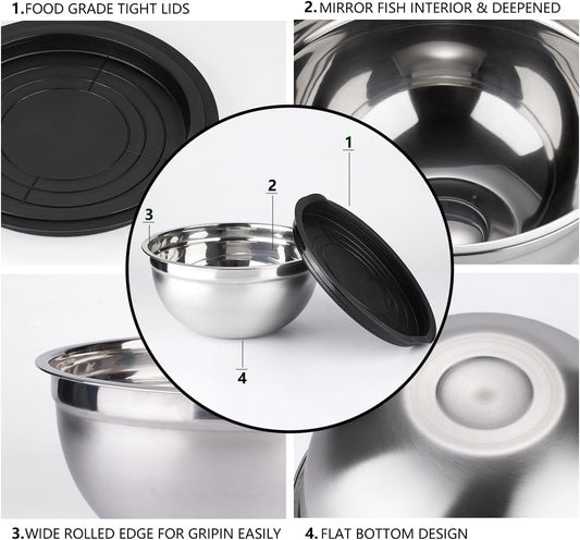 Rorence Stainless Steel Mixing Bowls: Stackable Mixing Bowl Set with Lids and Handles Non-slip Silicone Bottom Nesting Bowls for Kitchen Set of 3 - Black