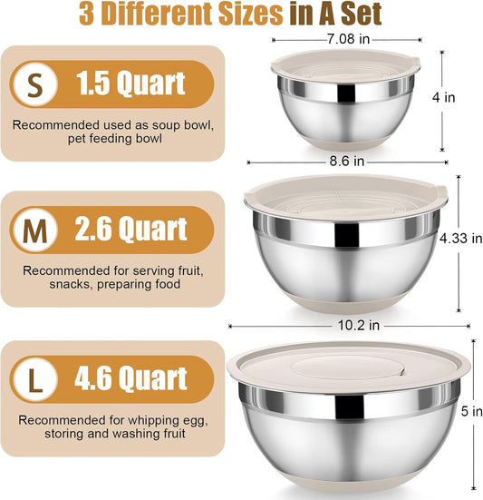 TeamFar Mixing Bowls, 6PCS Stainless Steel Nesting Mixing Salad Bowl with Lids & 3 Grater Attachments, for Food Cooking Baking Storing, Healthy, Khaki - 4.6/2.6/2 / 1.5/1 / 0.7 QT