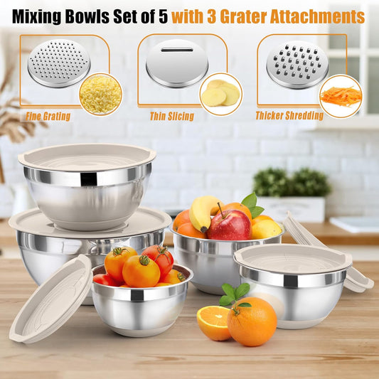 P&P CHEF Mixing Bowl with Lid Set, 5 Piece Stainless Steel Mixing Nesting Bowls for Salad Storage, 3 Grater Attachments & Non-Slip Bottoms, Size 1/1.5/2 / 2.6/4.6 QT, Khaki