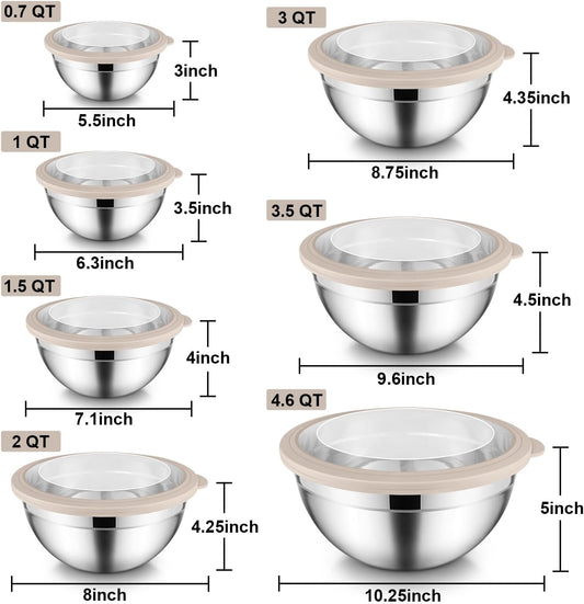 Rainbow Mixing Bowls with Lids Set of 7, Stainless Steel Nesting Bowl with Khaki Lid for Non-slip Mixing Prepping Storing Serving, 7 Sizes-7/3.6/2.7/2.1/1.5/1/0.8 QT