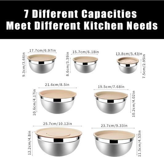 Rose Gold Mixing Bowls with Lids Set of 7, Stainless Steel Nesting Bowl with Khaki Lid for Non-slip Mixing Prepping Storing Serving, 7 Sizes-7/3.6/2.7/2.1/1.5/1/0.8 QT