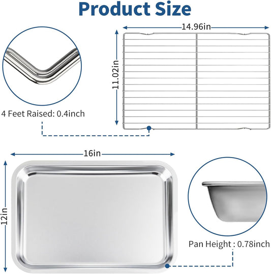 Baking Sheet with Rack Set of 4 (2 Pans + 2 Racks), 16 x 12 x 1 Inch Stainless Steel Cookie Pan with Cooling Rack, Non Toxic & Dishwasher Safe & Easy Clean for Baking, Cooling, Meats, Veggies