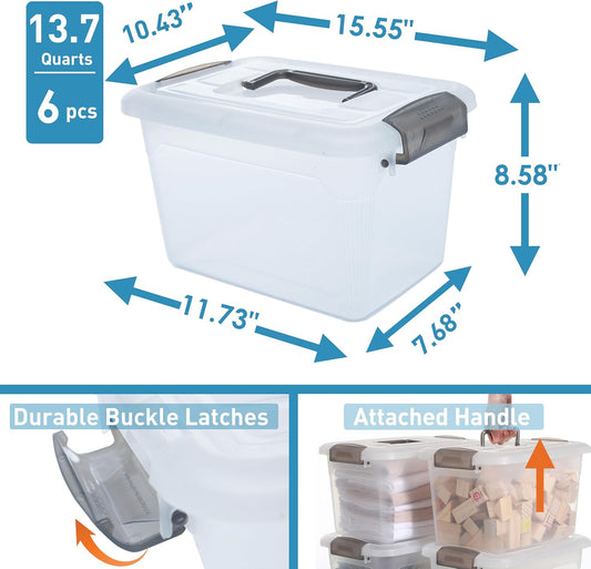 Citylife 6 Packs 13.7 QT Storage Bins with Lids Clear Plastic Bins with Grey Handle Stackable Storage Containers for Organizing