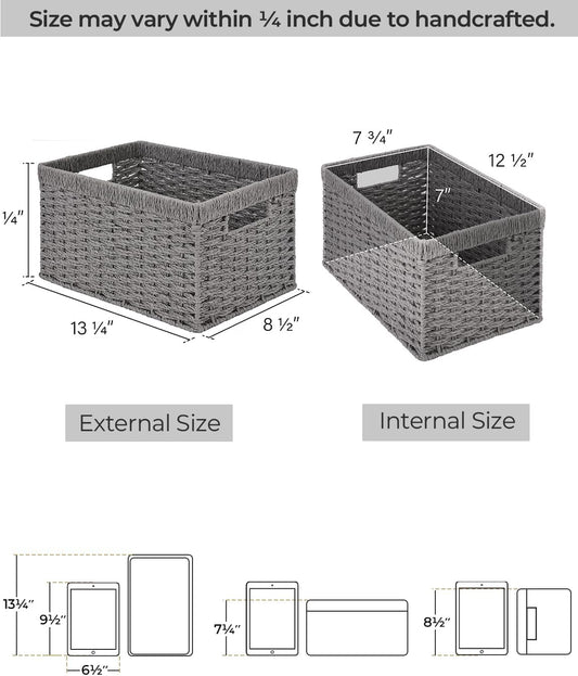 StorageWorks Round Paper Rope Storage Baskets, Rectangular Wicker Baskets with Built-in Handles, Gray, 2-Pack