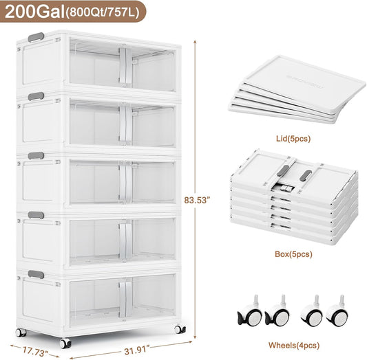 800QT Stackable Storage Bins with Lids, 200Gal Extra Large Collapsible Storage Box with Wheel, Plastic Storages with Clear Door Open Front for Home Bedroom Garage, White-5pack(5 lids)