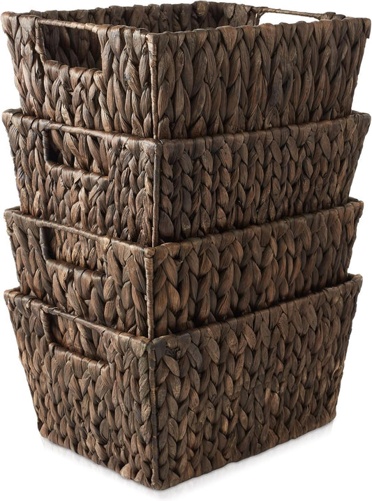Casafield Set of 4 Water Hyacinth Storage Baskets with Handles - Espresso, Woven Rectangular Storage Bins for Shelves, Blankets, Laundry Organization
