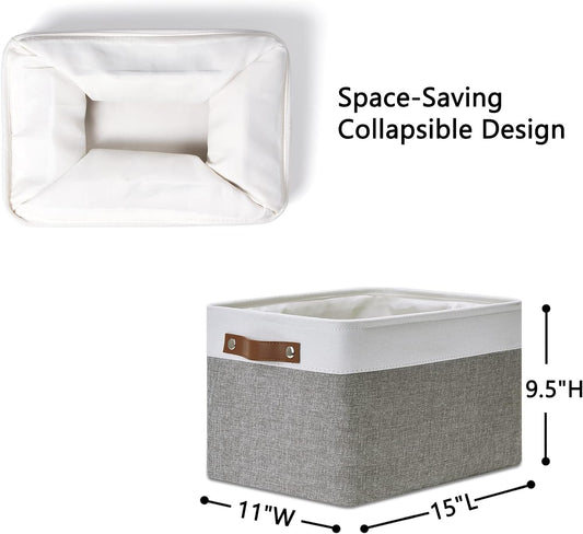 DULLEMELO Large Storage Baskets, Fabric Storage Basket with Leather Handles for Shelves Closet Nursery Toy Storage, Collapsible Fabric Baskets for Toy Book Magazine Towel Organizers(White&Gray)