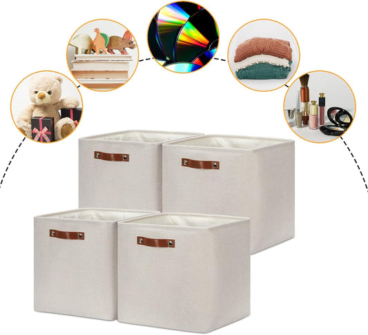 DULLEMELO Storage Bins, 4 Pack Of 13x13x13 Decorative Storage Cube Bins Suit Office, Home, Shelves And Closet, Cube Storage Bin with Leather handle(4 Pack - 13" Beige)