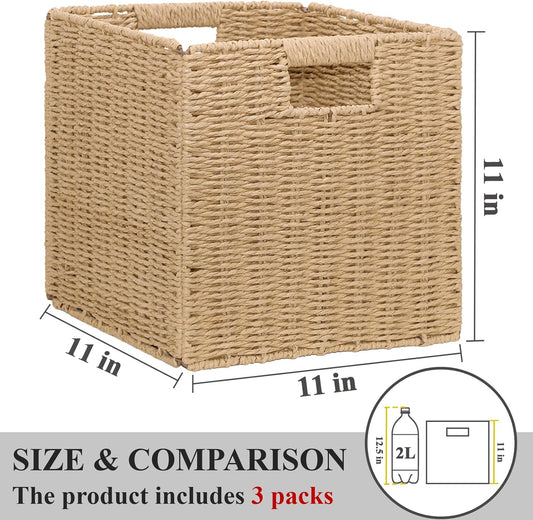 Wicker Storage Baskets for Organizing, 3 Pack Rustic Foldable Square Basket for Shelves, Handwoven Cubby Organizer Bins for Home Decor, Small Cube Storage Bin for Closet Organization (Natural 11 inch)