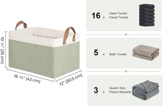 Storage Basket for Organizing - 17X15X12 inch 2 Pack Canvas Storage Bin for Shelves, Fabric Storage Cubes for Cloth Decorative Books Nursery (White & Green)