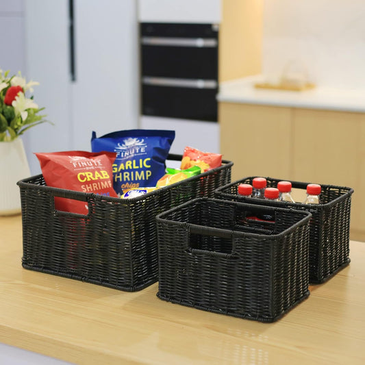 HOONEX Large Wicker Baskets for Storage, Woven Plastic With Dual Handles, Set of 3, Black