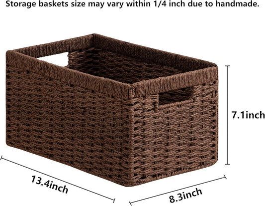 UBBCARE 2 Pack Wicker Basket, 13.4L×8.3H×7.1W inch Woven Paper Rope Storage Baskets for shelves, Foldable Rectangular Storage Baskets with Handle, Storage Basket for Organizing, Dark Brown