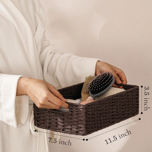 UBBCARE 2 Pack Wicker Basket, 11.5L×7.5H×3.5W inch Woven Paper Rope Storage Baskets for shelves, Foldable Rectangular Storage Baskets with Handle, Storage Basket for Organizing, Dark Brown