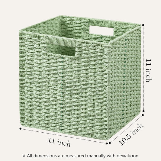 UBBCARE 3 Pack Wicker Basket, 11L×11H×10.5W inch Woven Paper Rope Storage Baskets for shelves, Foldable Cube Storage bin with Handle, Storage Basket for Organizing & Decor, Green