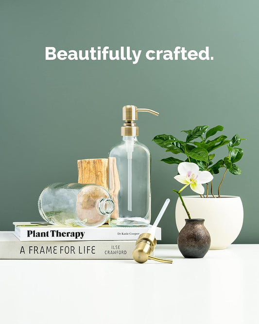 Vine Creations Amber Glass Soap Dispenser Set, Kitchen Soap Dispenser Set with Ceramic Tray, 16 oz Dish Soap and Hand Soap Dispensers with Stainless Steel Pump Decor (Amber Bottle/Brushed Brass)