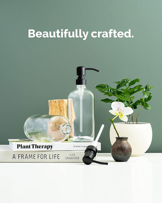 Vine Creations Glass Soap Dispenser Set, Kitchen Soap Dispenser Set with Ceramic Tray, 16 oz Dish Soap and Hand Soap Dispensers with Stainless Steel Pump Decor (Clear Bottle/Matte Black)