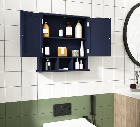 ChooChoo Bathroom Cabinet Wall Mounted 2-Door with 3 Open Shelves, Wooden Medicine Cabinets with Adjustable Shelf,Space Saver Storage Cabinets Over The Toilet for Bathroom&Living Room,Blue