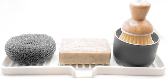 Happitasa Silicone Soap Dish Tray and Sponge Holder with Drain Chute | Bathroom and Kitchen Sink Organizer Caddy (White, 12"x4", 7.4 Ounces)